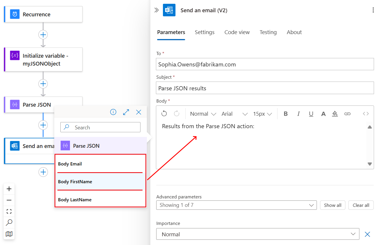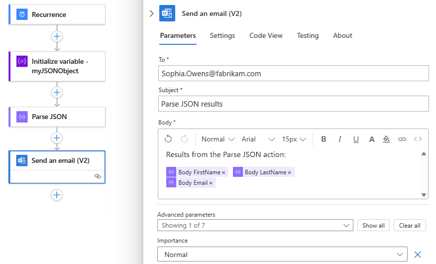 To try the Parse JSON action, follow these steps by using the workflow designer. Or, if you prefer working in the code view editor, you can copy the example Parse JSON and Initialize variable action definitions from this guide into your own logic app's underlying workflow definition: Data operation code examples - Parse JSON. For more information about this action in your underlying workflow definition, see Parse JSON action.