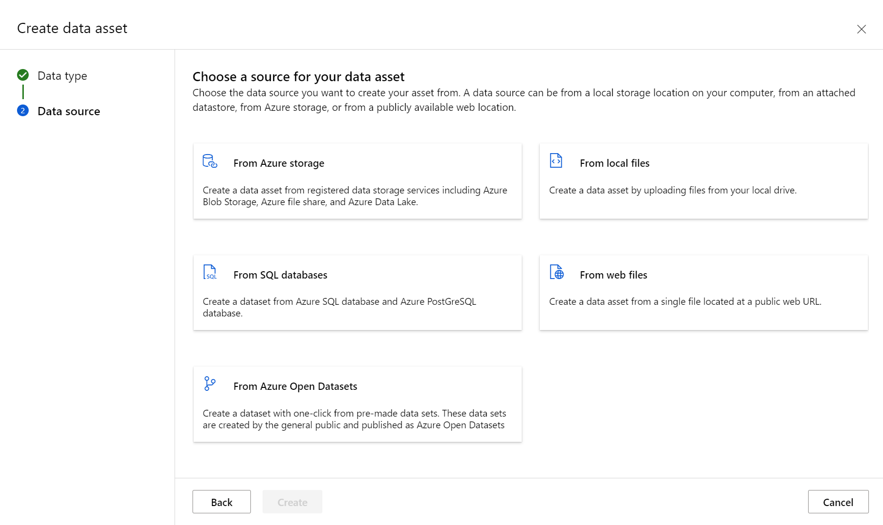 You have different options for your data source. For data already stored in Azure, choose "From Azure storage." To upload data from your local drive, choose "From local files." For data stored at a public web location, choose "From web files." You can also create a data asset from a SQL database, or from Azure Open Datasets.