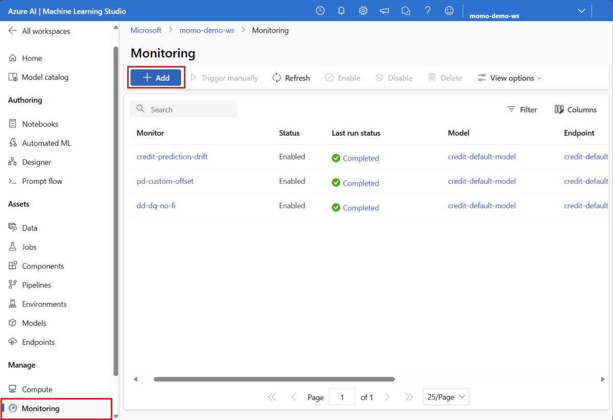 In the studio, under Manage, select Monitoring. In the Monitoring page, select the name of your model monitor to see its overview page. This page shows the monitoring model, endpoint, and deployment. It also provides detailed information about configured signals. The following image shows a monitoring overview page that includes data drift and data quality signals.