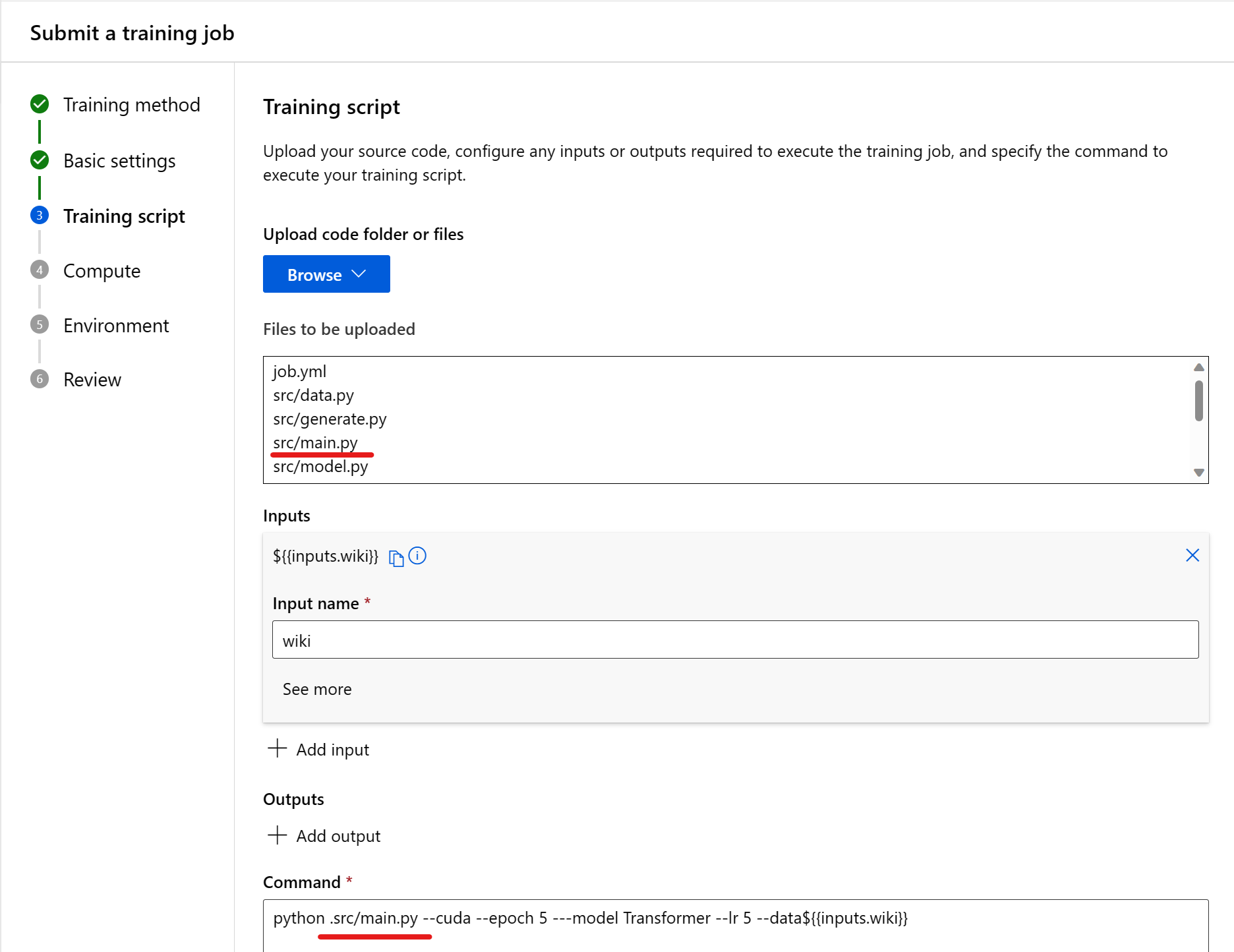 In the next section, we walk through the form with the steps for running a custom training script (command job).