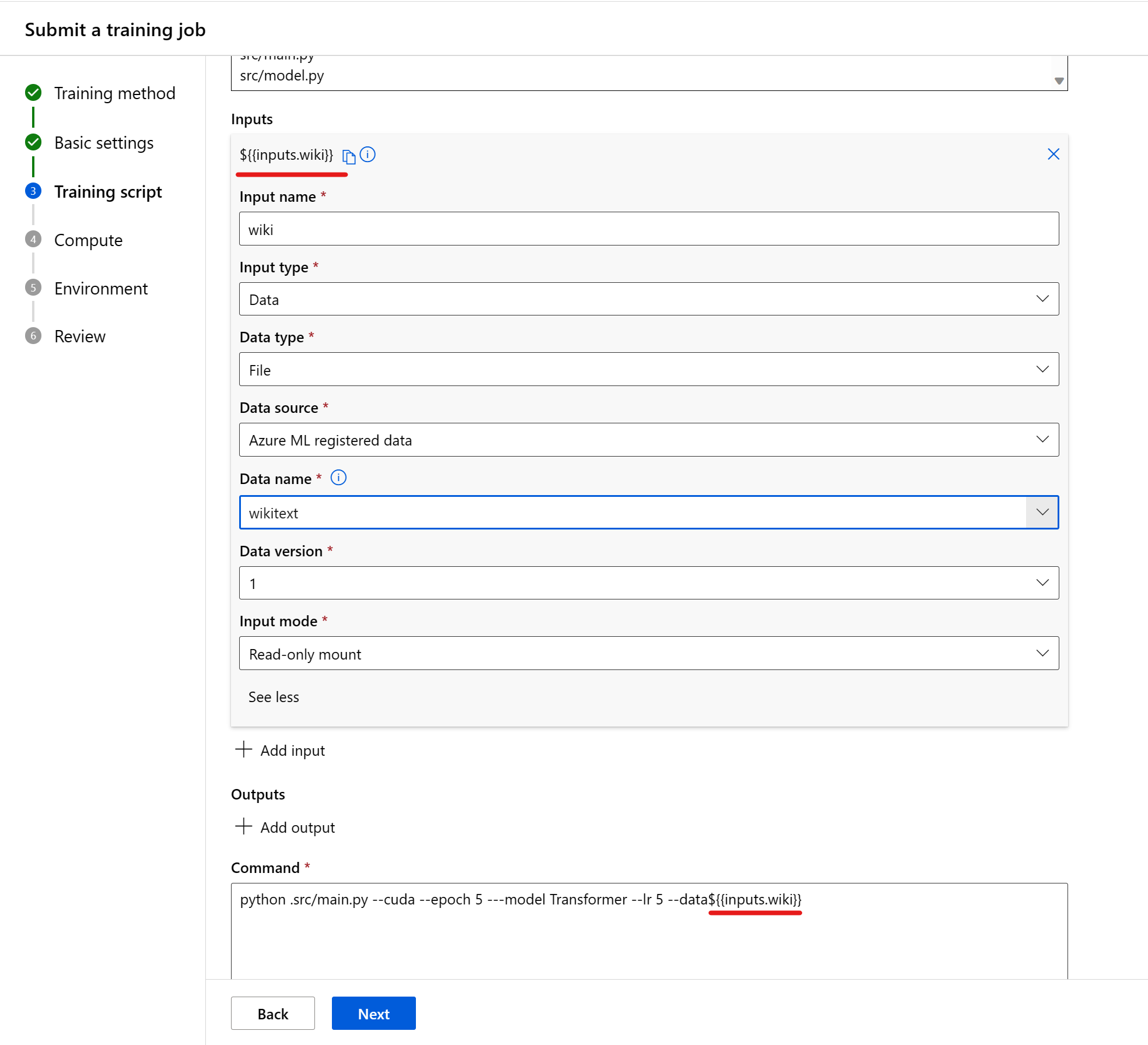 When you use an input in the command, you need to specify the input name. To indicate an input variable, use the form ${{inputs.input_name}}. For instance, ${{inputs.wiki}}. You can then refer to it in the command, for instance, --data ${{inputs.wiki}}.
