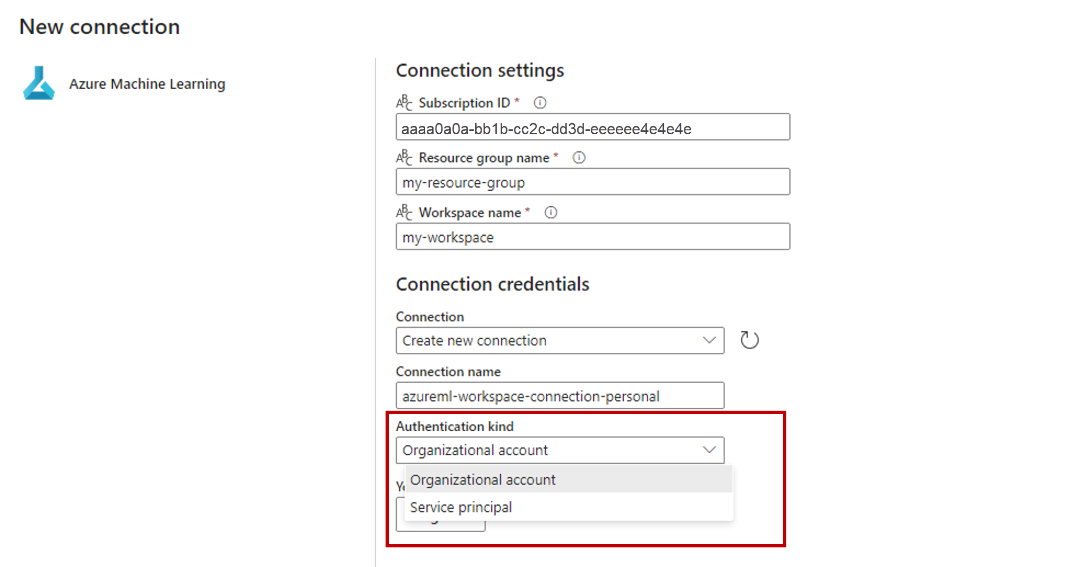 In the Connection credentials section, select Organizational account as the value for the Authentication kind for your connection. Organizational account uses the credentials of the connected user. Alternatively, you could use Service principal. In production settings, we recommend that you use a Service principal. Regardless of the authentication type, ensure that the identity associated with the connection has the rights to call the batch endpoint that you deployed.