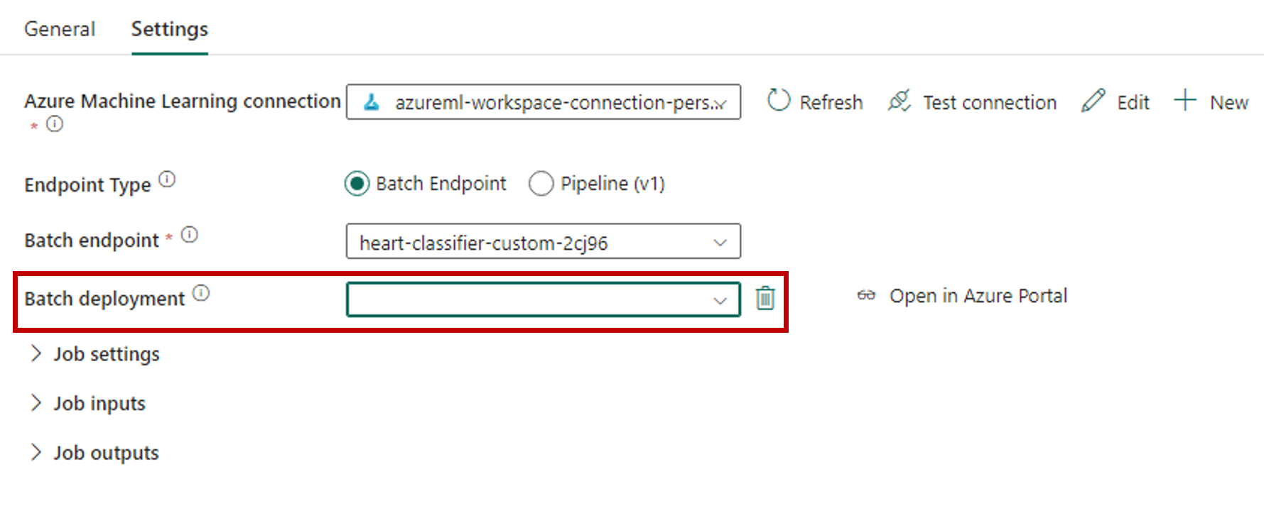 The Batch deployment section automatically populates with the available deployments under the endpoint.