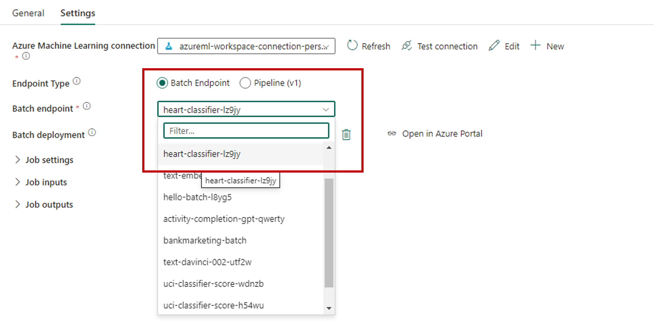 Save the connection. Once the connection is selected, Fabric automatically populates the available batch endpoints in the selected workspace.