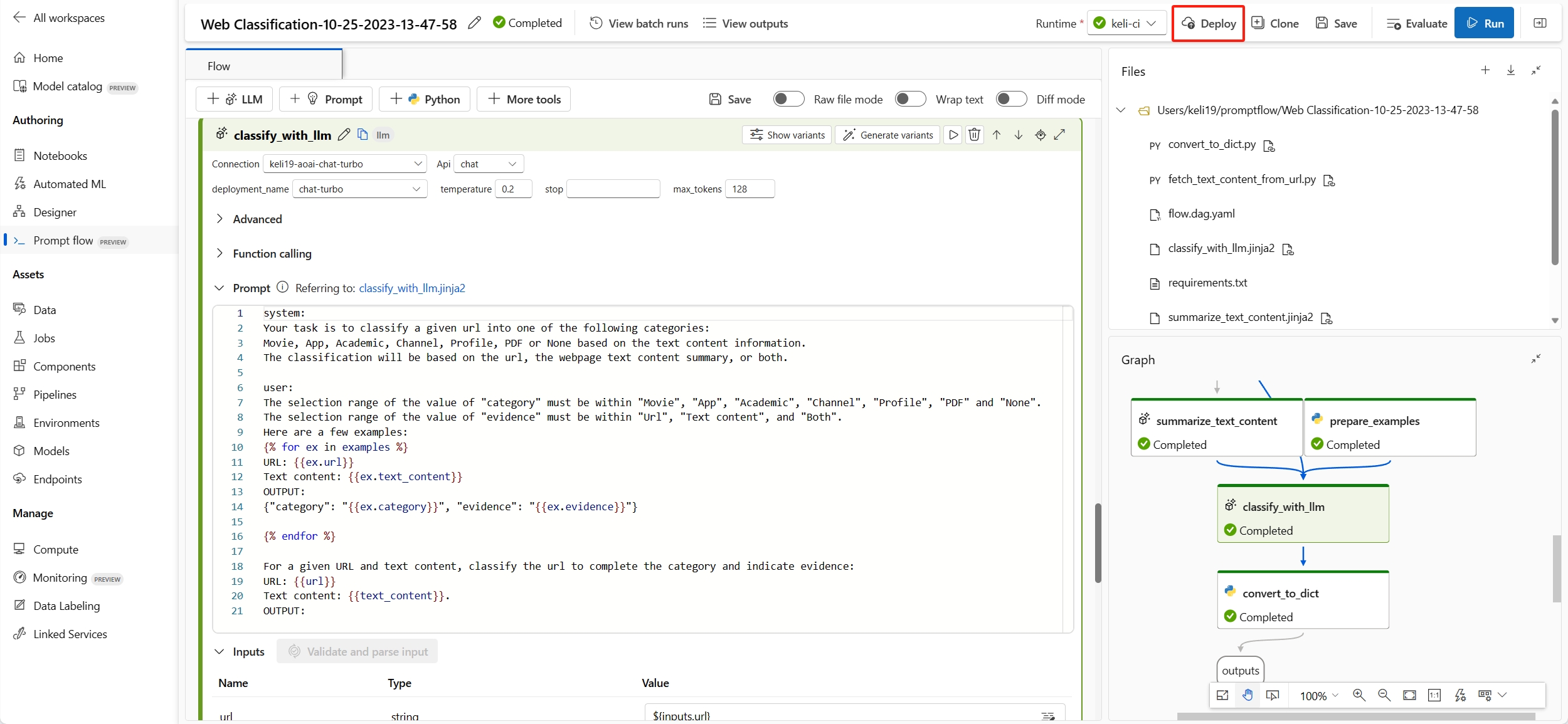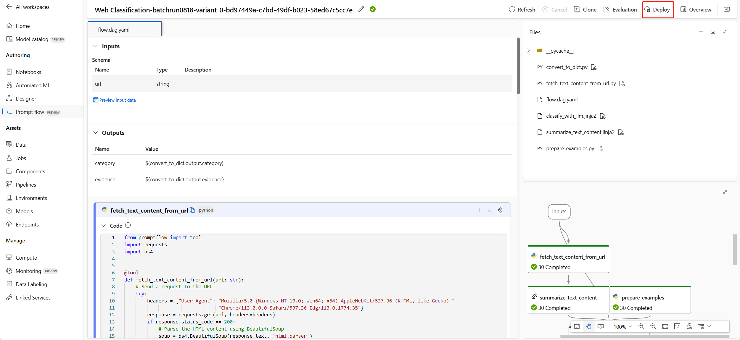 We'll use the sample flow Web Classification as example to show how to deploy the flow. This sample flow is a standard flow. Deploying chat flows is similar. Evaluation flow doesn't support deployment.