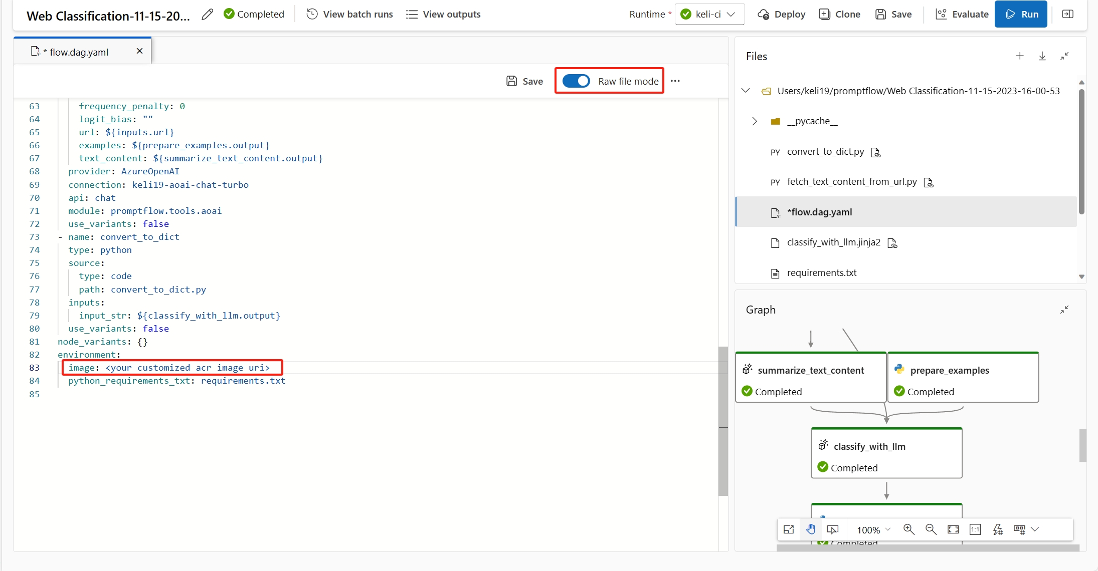flow.dag.yamlby selectingRaw file modeof the flow. If there is no image specified, the default base image is the latest prompt flow base image.You can find