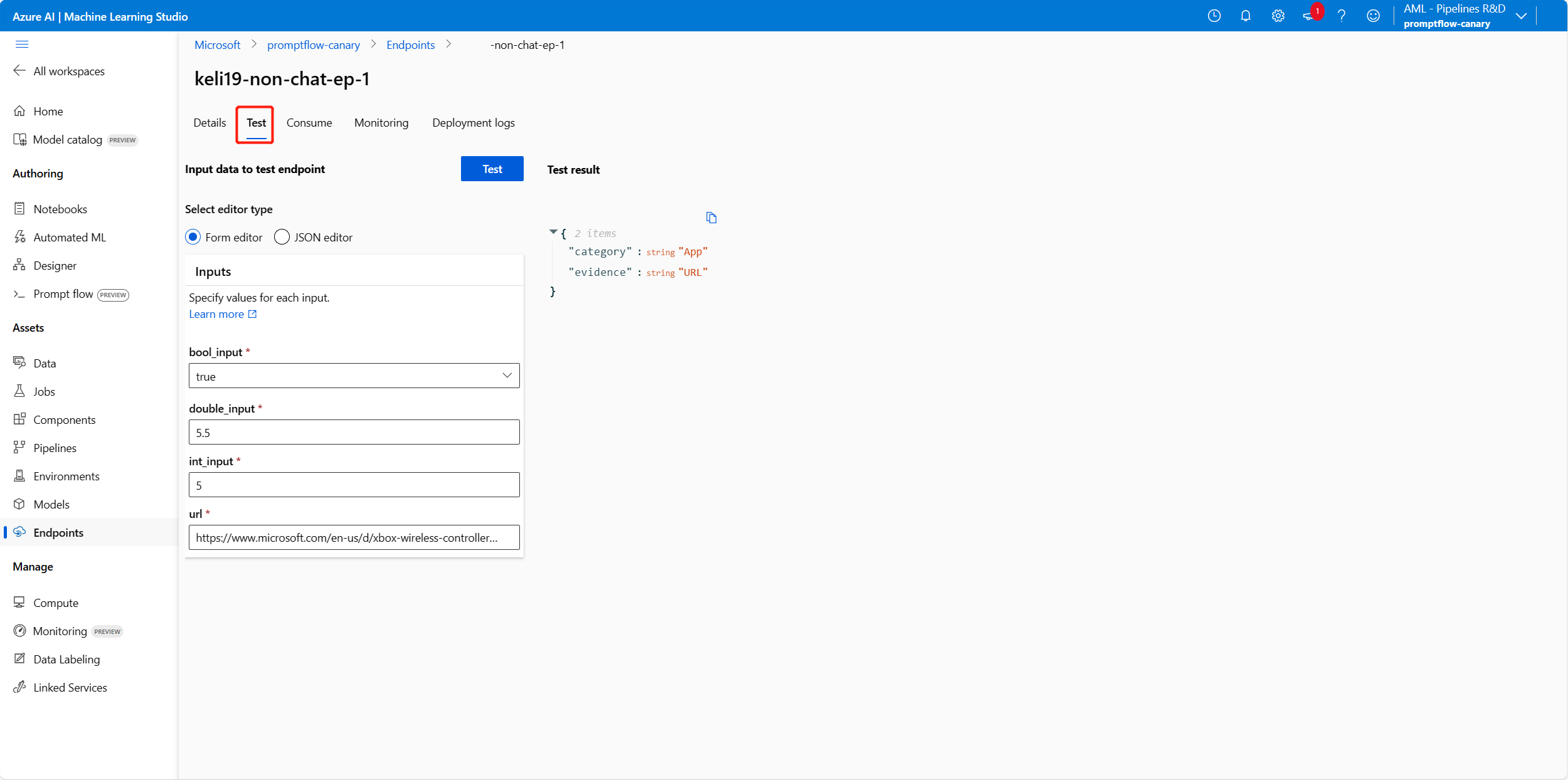 In the endpoint detail page, switch to the Consume tab. You can find the REST endpoint and key/token to consume your endpoint. There is also sample code for you to consume the endpoint in different languages.