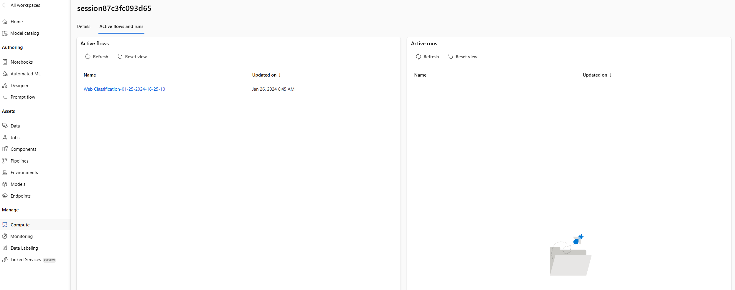 requirements.txtfile in the flow folder. - Reset compute session deletes the current compute session and creates a new one with the same environment. If you encounter a package conflict issue, you can try this option.