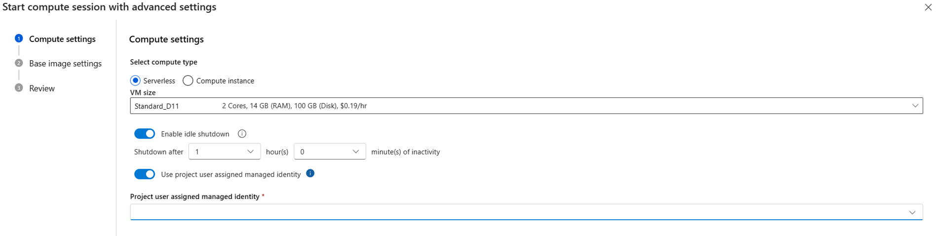 assignpermission on the user-assigned managed identity. Assign theManaged Identity Operatorrole, as each time a serverless compute session is created, the user-assigned managed identity is assigned to the compute.If you choose compute instance as compute type, you can only set idle shutdown time.