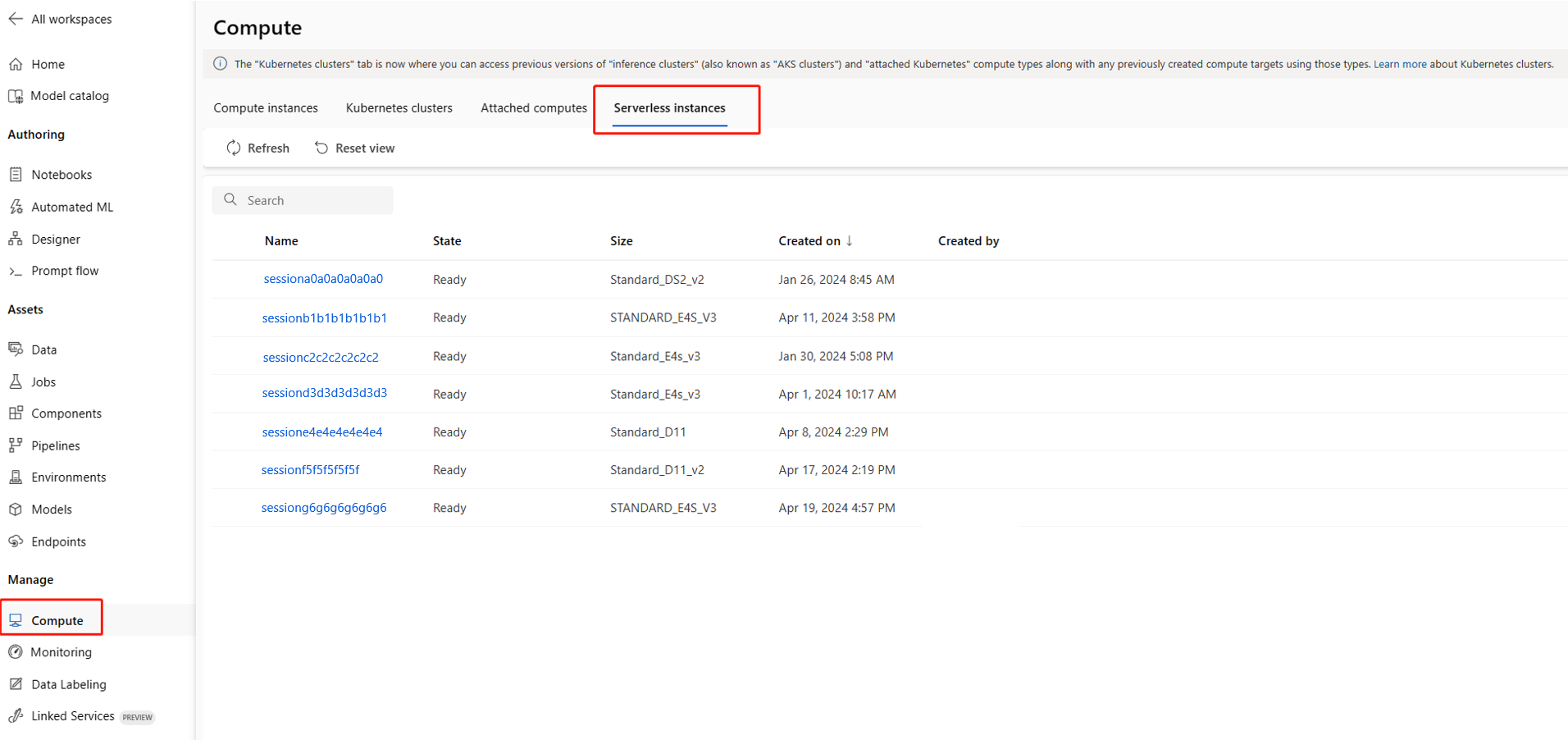 Use serverless compute as a compute session to manage the serverless instance. View the serverless instance in the compute session list tab on the compute page.