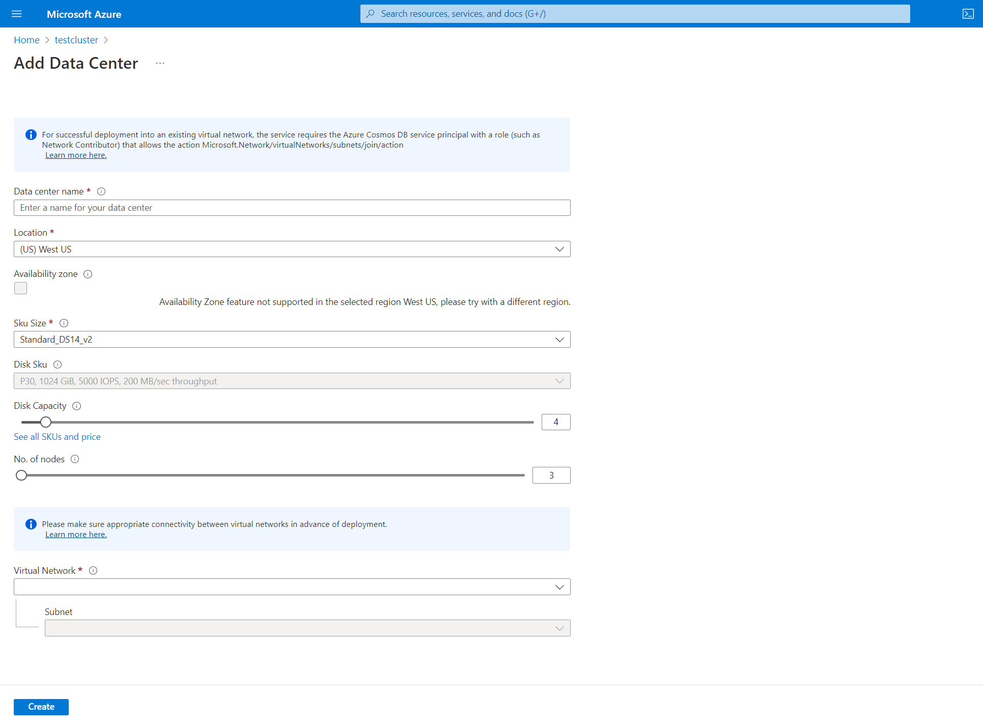 If you add a datacenter in a different region, you need to select a different virtual network. Ensure that this virtual network has connectivity to the primary region's virtual network that was created previously. Also, make sure that any other virtual networks that host datacenters are within the managed instance cluster. For more information, see Connect virtual networks with virtual network peering.