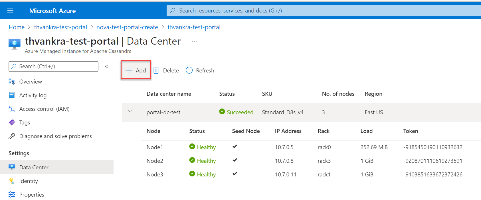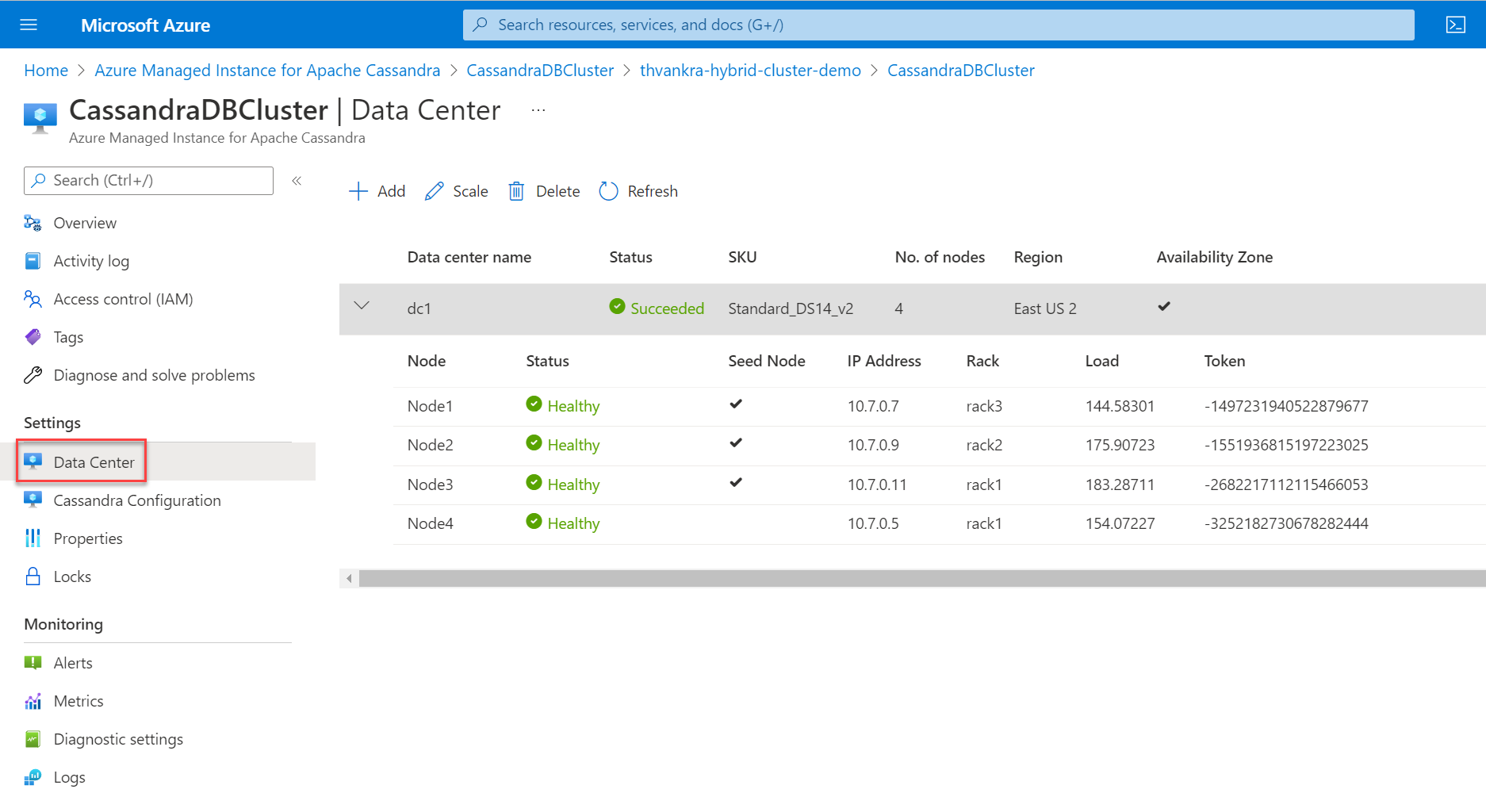 rebuildto replicate the historical data. In the Azure CLI, use the following command and runnodetool rebuildon each node of the new datacenter. This action replaces<new dc ip address>with the IP address of the node and replaces<olddc>with the name of your existing datacenter:az managed-cassandra cluster invoke-command \ --resource-group $resourceGroupName \ --cluster-name $clusterName \ --host <new dc ip address> \ --command-name nodetool --arguments rebuild="" "<olddc>"=""