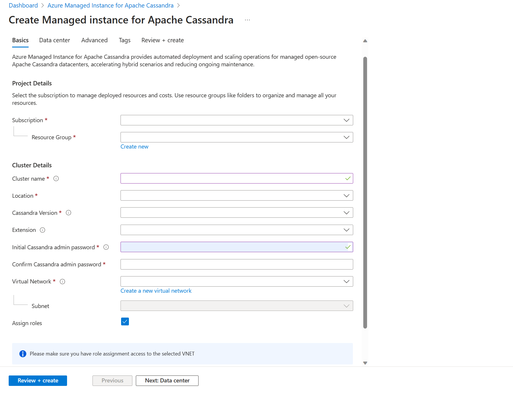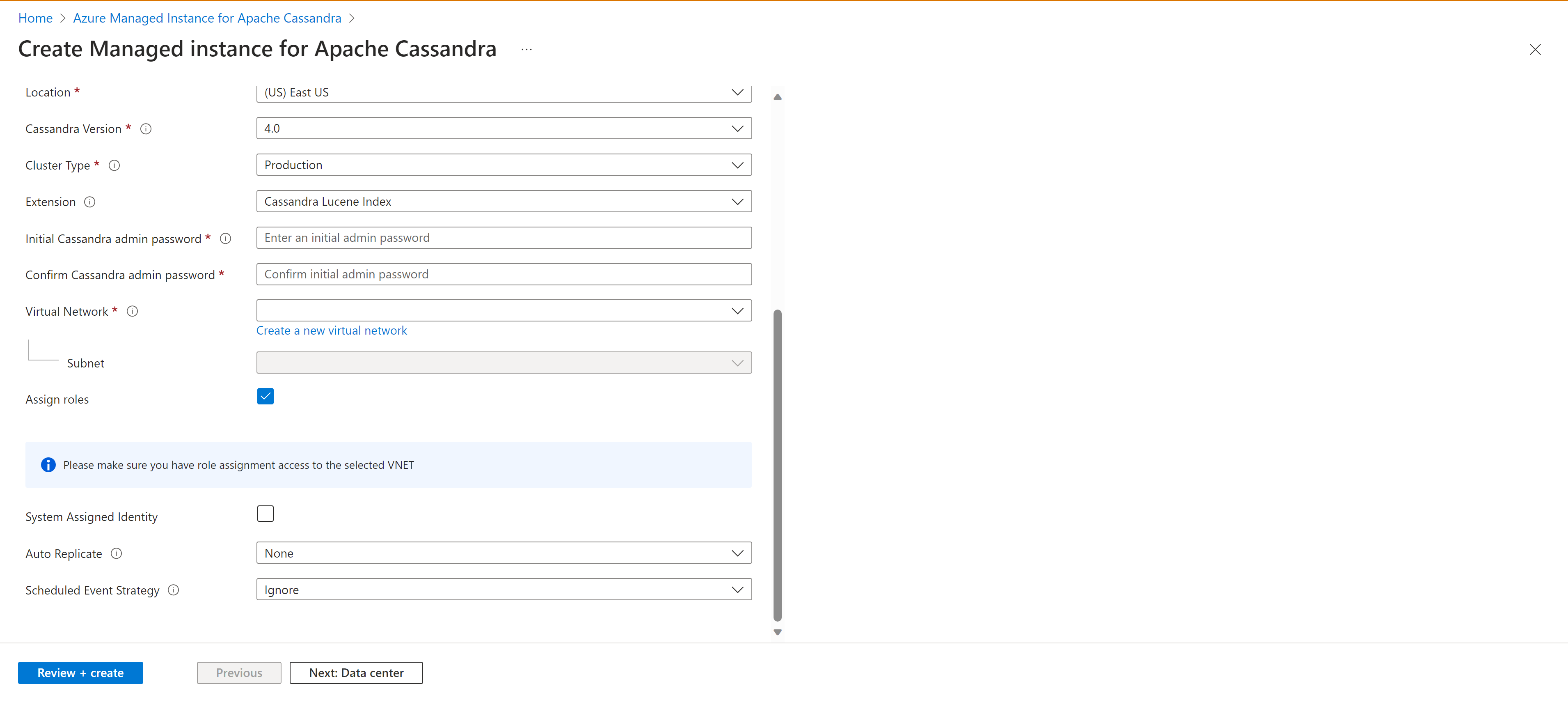 Assign roles: Virtual networks require special permissions to allow managed Cassandra clusters to be deployed. Keep this box selected if you create a new virtual network or use an existing virtual network without permissions applied. If you use a virtual network where you previously deployed Azure SQL Managed Instance Cassandra clusters, clear this option.
