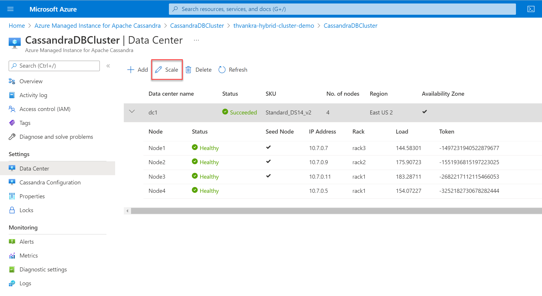 After you deploy a cluster with a single datacenter, you can scale horizontally or vertically. Highlight the datacenter and then select Scale.