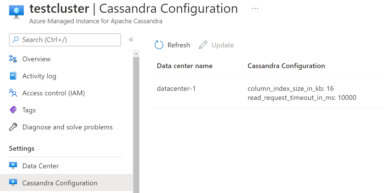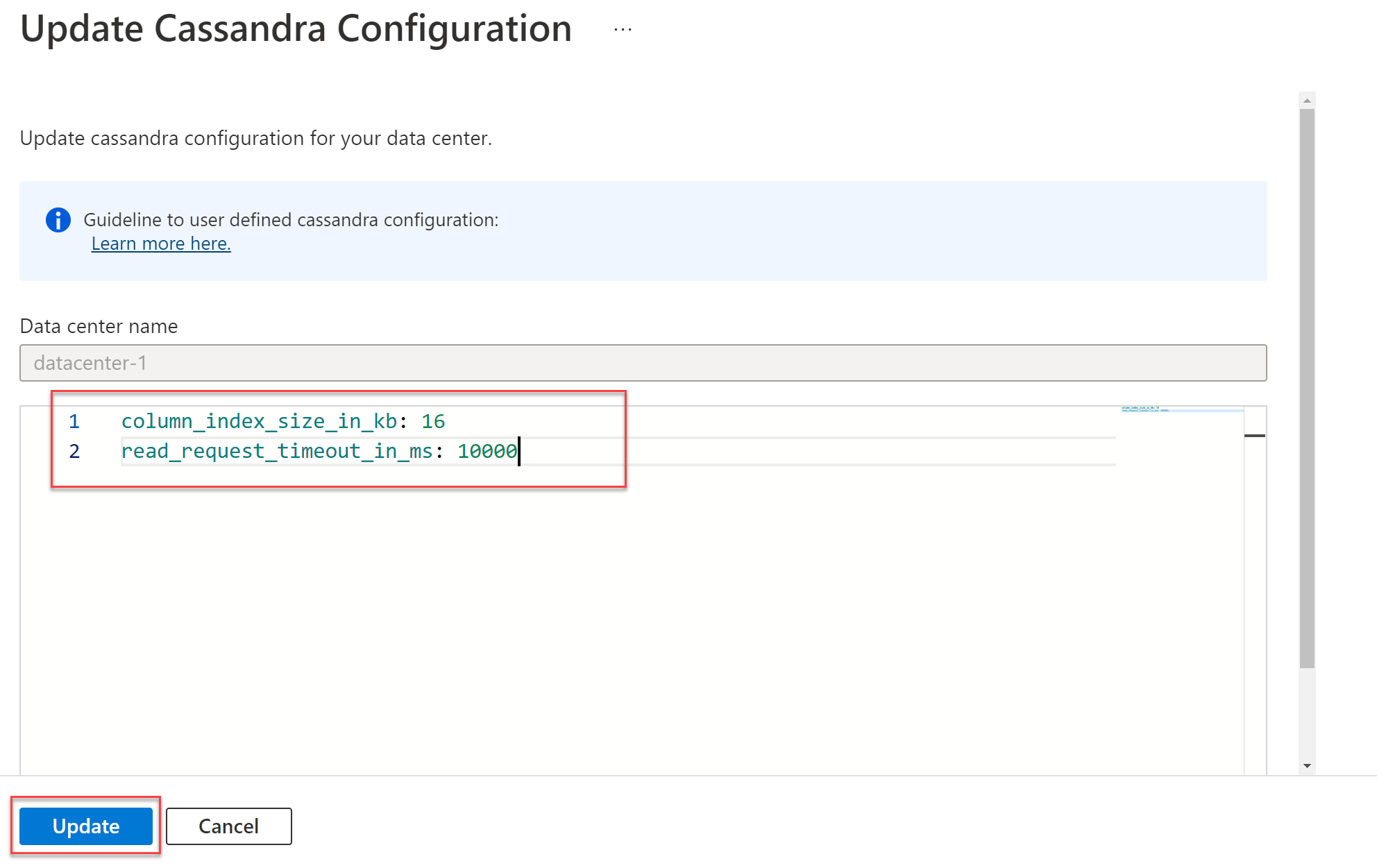 You can use the Azure portal or CLI commands to update Cassandra YAML configuration on a datacenter. To update settings in the portal: