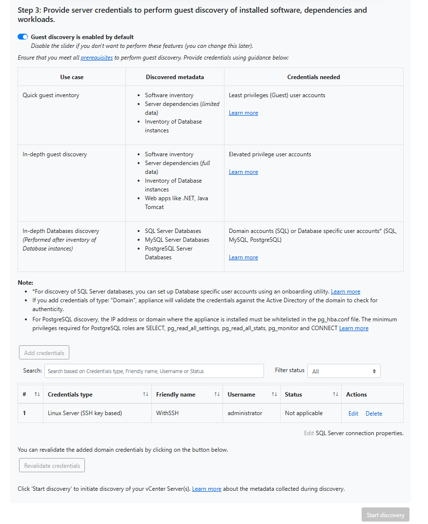 - In Step 3: Provide server credentials to perform guest discovery of installed software, dependencies and workloads, select Add credentials to provide multiple server credentials to perform software inventory.