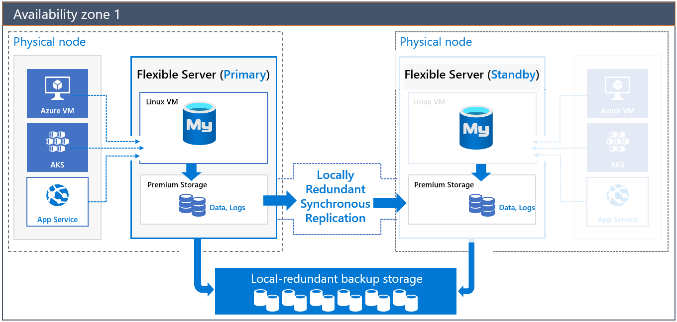 The database server name connects applications to the primary server. Standby replica information isn't exposed for direct access. Commits and writes are acknowledged after the log files are flushed at the primary server's LRS. Because the primary and the standby replica are in the same zone, there's less replication lag and lower latency between the application server and the database server. The Local-redundant setup doesn't provide high-availability when dependent infrastructures are down for the specific availability zone. There's downtime until all dependent services are back online for that availability zone.