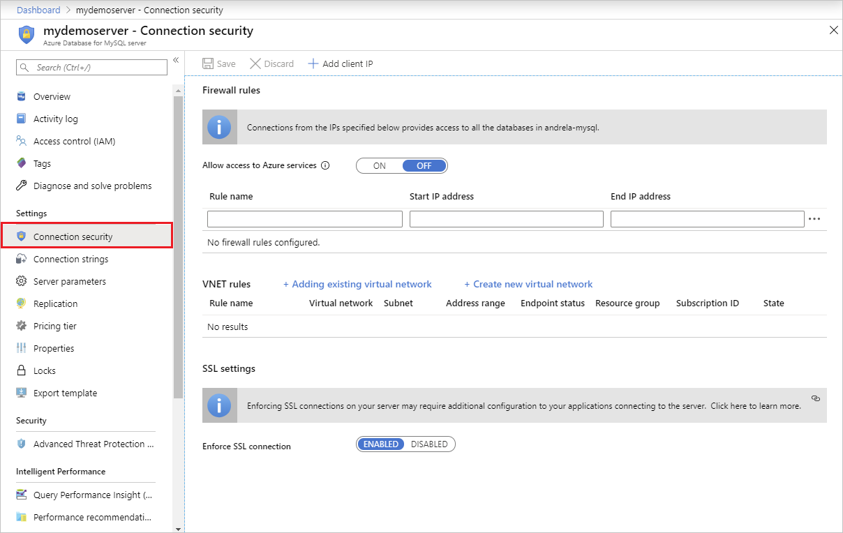 In the Connectivity method, select Public access (allowed IP addresses). To create the Firewall rules, specify the Firewall rule name and a single IP address or a range of addresses. If you want to limit the rule to a single IP address, type the same address in the field for the Start IP address and End IP address. Opening the firewall enables administrators, users, and applications to access any database on the MySQL server to which they have valid credentials.