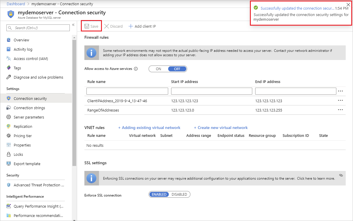 Verify your IP address before saving the configuration. In some situations, the IP address observed by the Azure portal differs from the IP address used when accessing the internet and Azure servers. Therefore, you might need to change the Start and End IP addresses to make the rule function as expected.