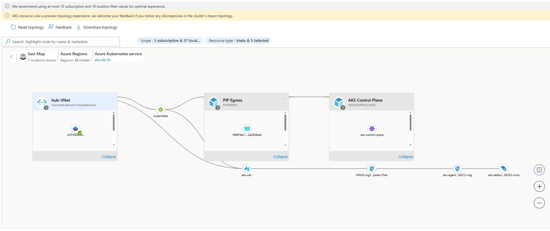 AKS network topology visualization provides a graphical representation of the networking resources associated with your AKS cluster. This includes virtual networks (VNets), subnets, network security groups (NSGs), load balancers, NAT gateways, public IPs, and more. The visualization helps you: