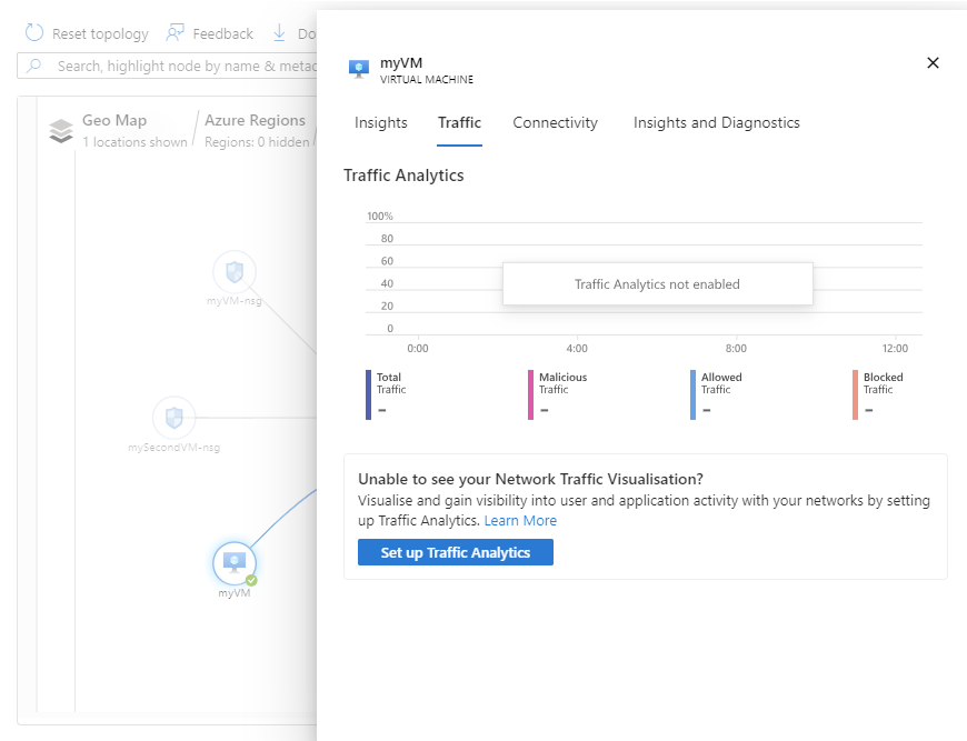 Select the Traffic tab to see detailed traffic information about the selected VM. The insights presented in this tab are fetched from Network Watcher flow logs and traffic analytics. You see Set up Traffic Analytics with no insights if traffic analytics isn't enabled.