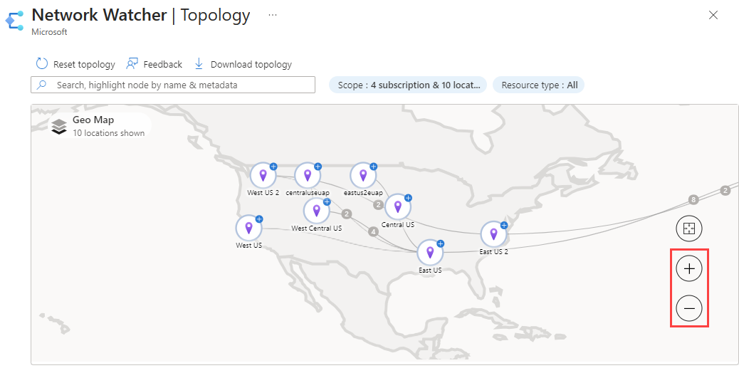 Use the mouse wheel to zoom in or out, or select the plus or minus sign. You can also use the mouse to drag the topology to move it around or use the arrows on the screen.
