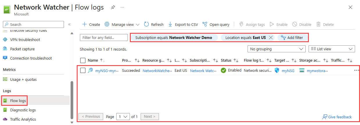 You can list all flow logs in a subscription or a group of subscriptions (Azure portal). You can also list all flow logs in a region.