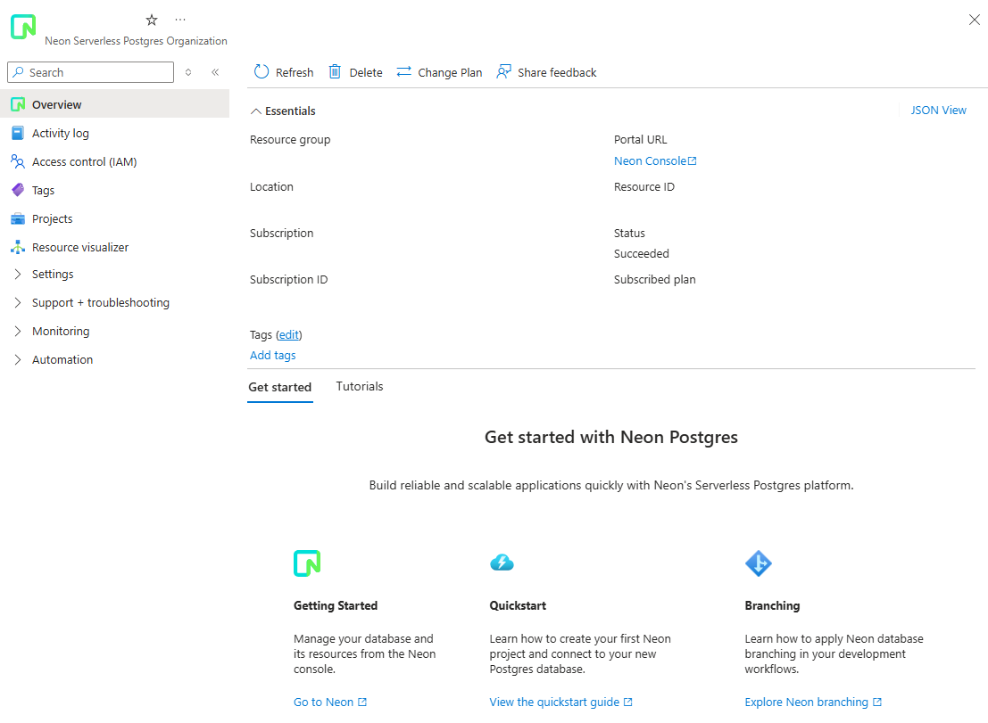 This article describes how to manage a Neon resource in the Azure portal.