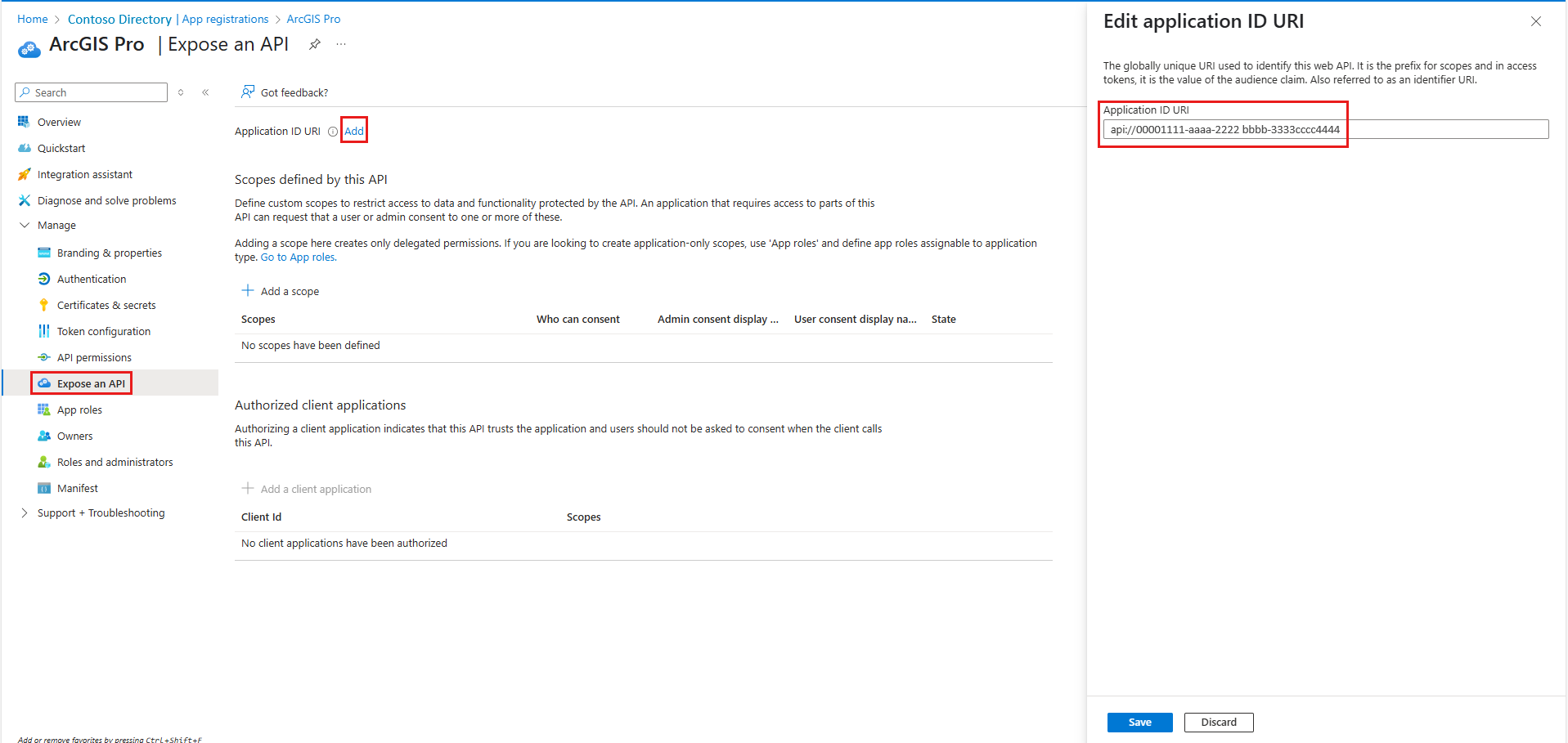 arcgis-pro://auth. Select Configure.Under Implicit grant and hybrid flows, select the checkbox for ID tokens (used for implicit and hybrid flows). Select Save.