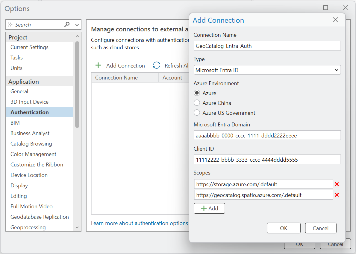 This section outlines how to configure authentication and data access in the ArcGIS Pro desktop application. You use OAuth 2.0 integration with Microsoft Entra ID and access the Microsoft Planetary Computer Pro GeoCatalog. This section includes steps to add an authentication connection and create storage and STAC data connections.