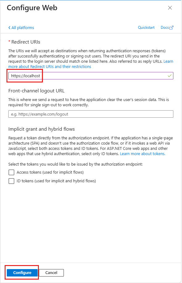 <https://localhost>. Select Configure.Return to Authentication > Add a platform, and then select Mobile and desktop applications.
