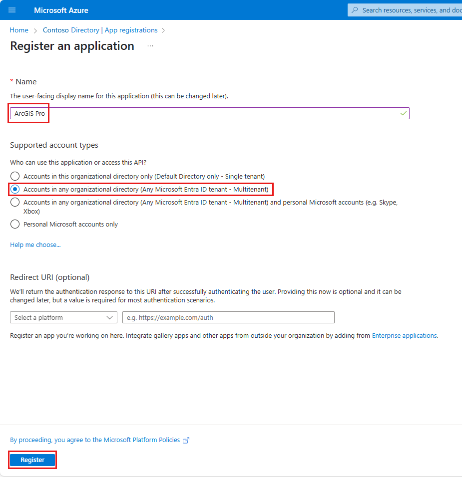 Create a second app registration for the ArcGIS Pro desktop client with one of these suggested names: ArcGISPro-GeoCatalog-DesktopClient or GeoCatalog-ArcGIS. Set the account type by selecting Single tenant.