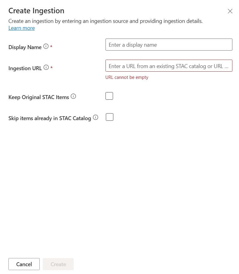To create your ingestion, input a Display Name and Ingestion URL (URL of the STAC catalog JSON organizing your STAC items). You can also configure the following options: