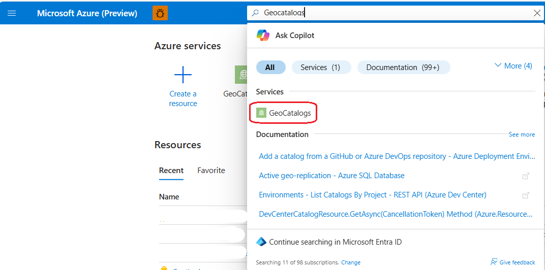 Use the search bar to search for GeoCatalogs. Select GeoCatalogs from under the list of Services.
