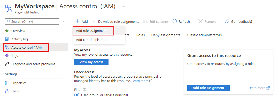You can grant a user access to a Microsoft Playwright Testing workspace by using the Azure portal: