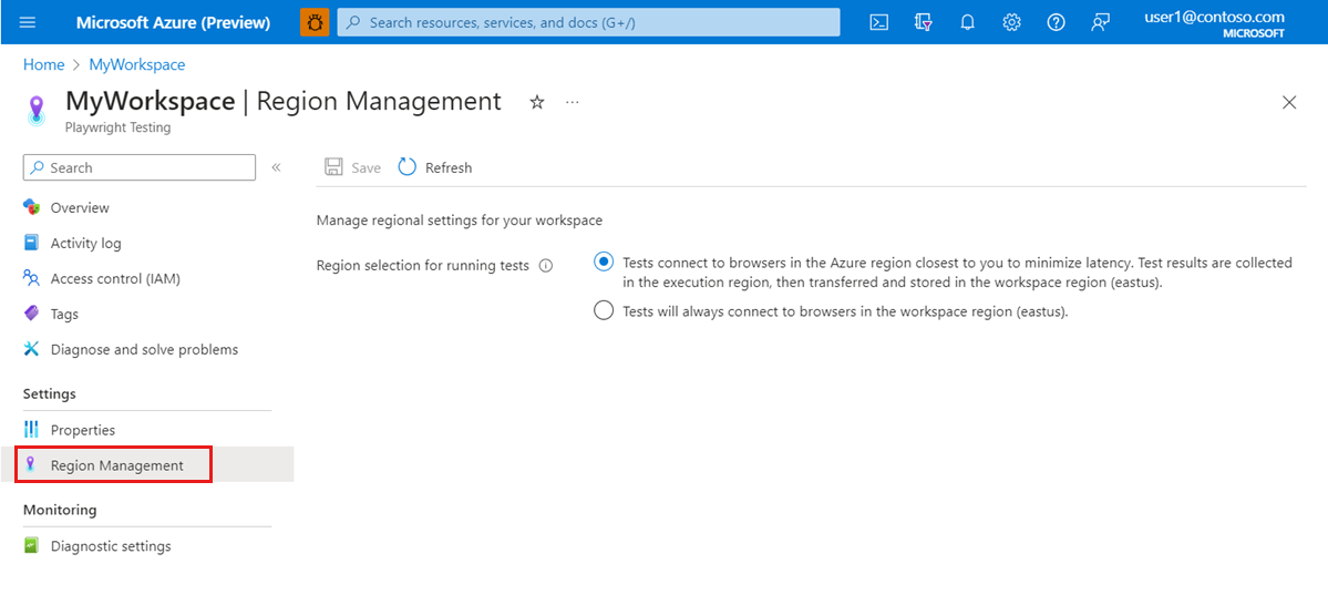 By default, when you create a new workspace, the service runs tests in an Azure region closest to the client machine. When you disable this setting on the workspace, the service uses remote browsers in the Azure region of the workspace.