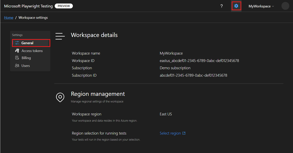 Screenshot that shows the workspace settings page in the Playwright Testing portal.