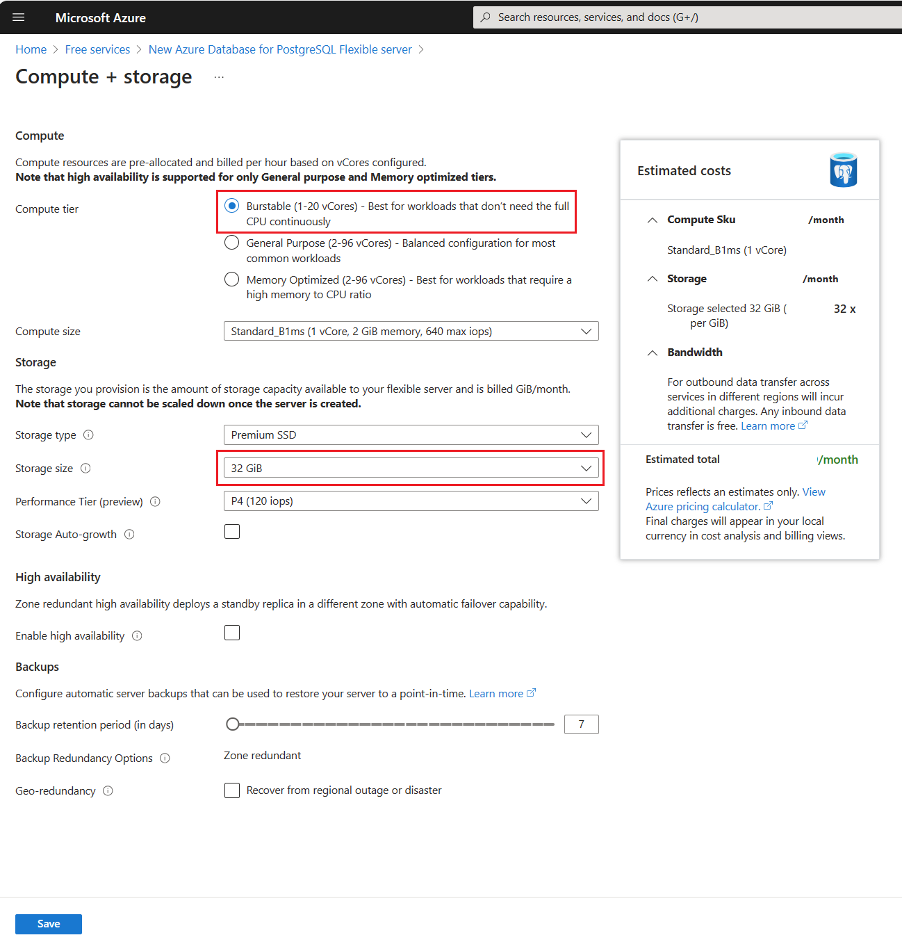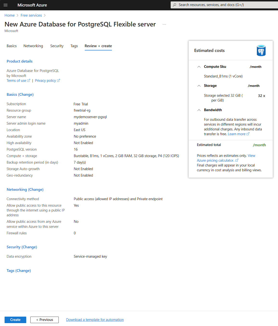When creating the Azure Database for PostgreSQL flexible server instance using your Azure free account, you will see an Estimated cost per month in the Compute + Storage: Cost Summary blade and the Review + Create tab. However, as long as you stay within the monthly limits of your Azure free account (refer to the Monitor and track free services usage section below for usage information). There is no charge for the service. We are currently working to improve the Cost Summary experience for free services.
