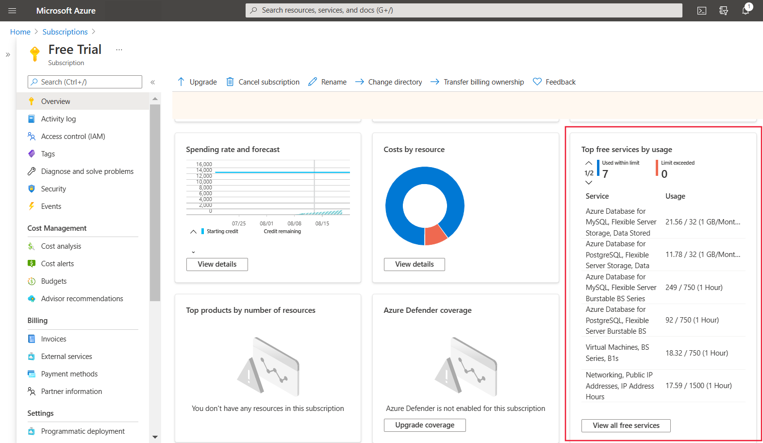 On the Overview page, scroll down to show the tile Top free services by usage, and then select View all free services.