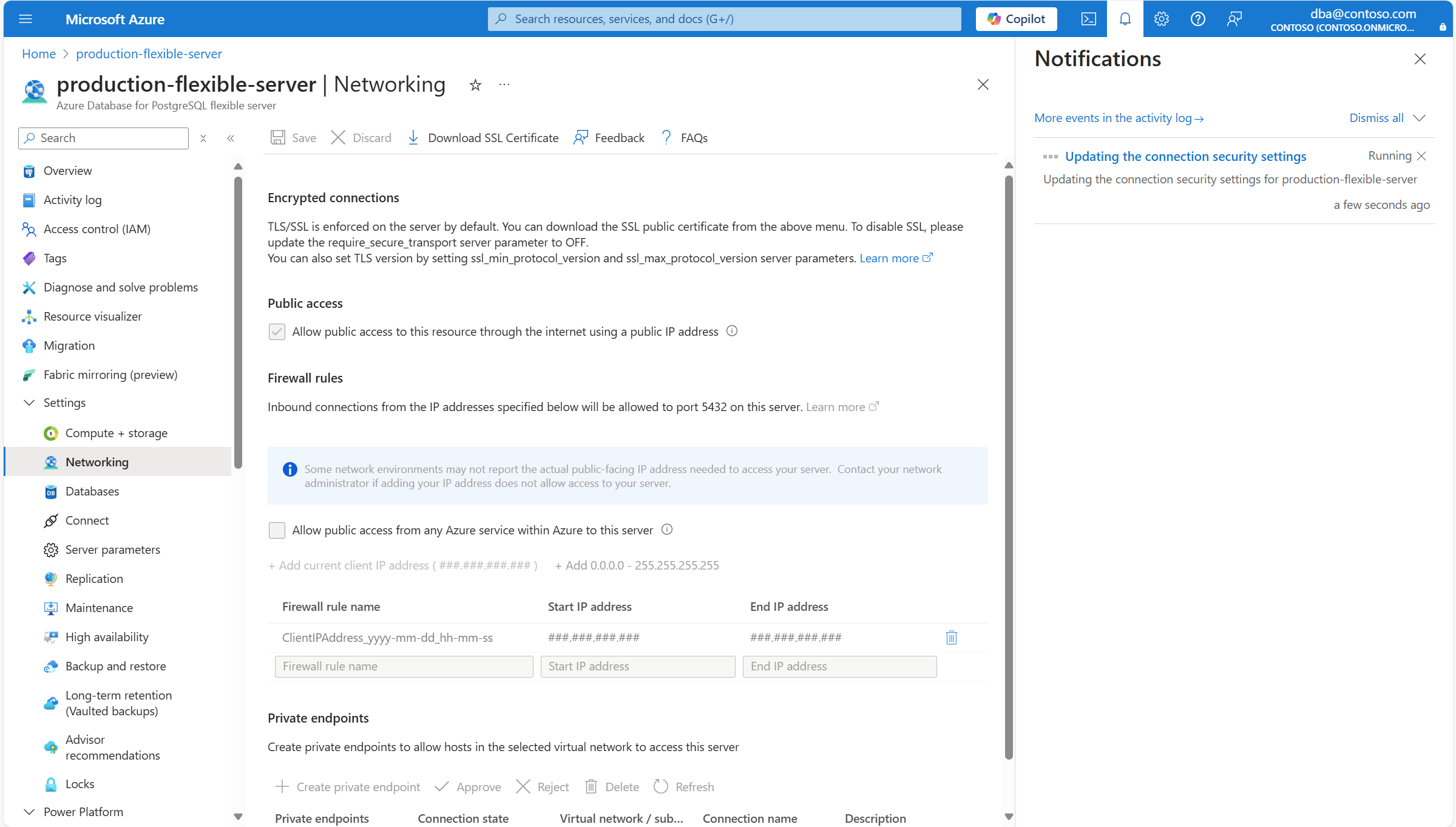 With public access enabled, you can configure firewall rules to allow connections originating from specific IP addresses, or from any Azure service.