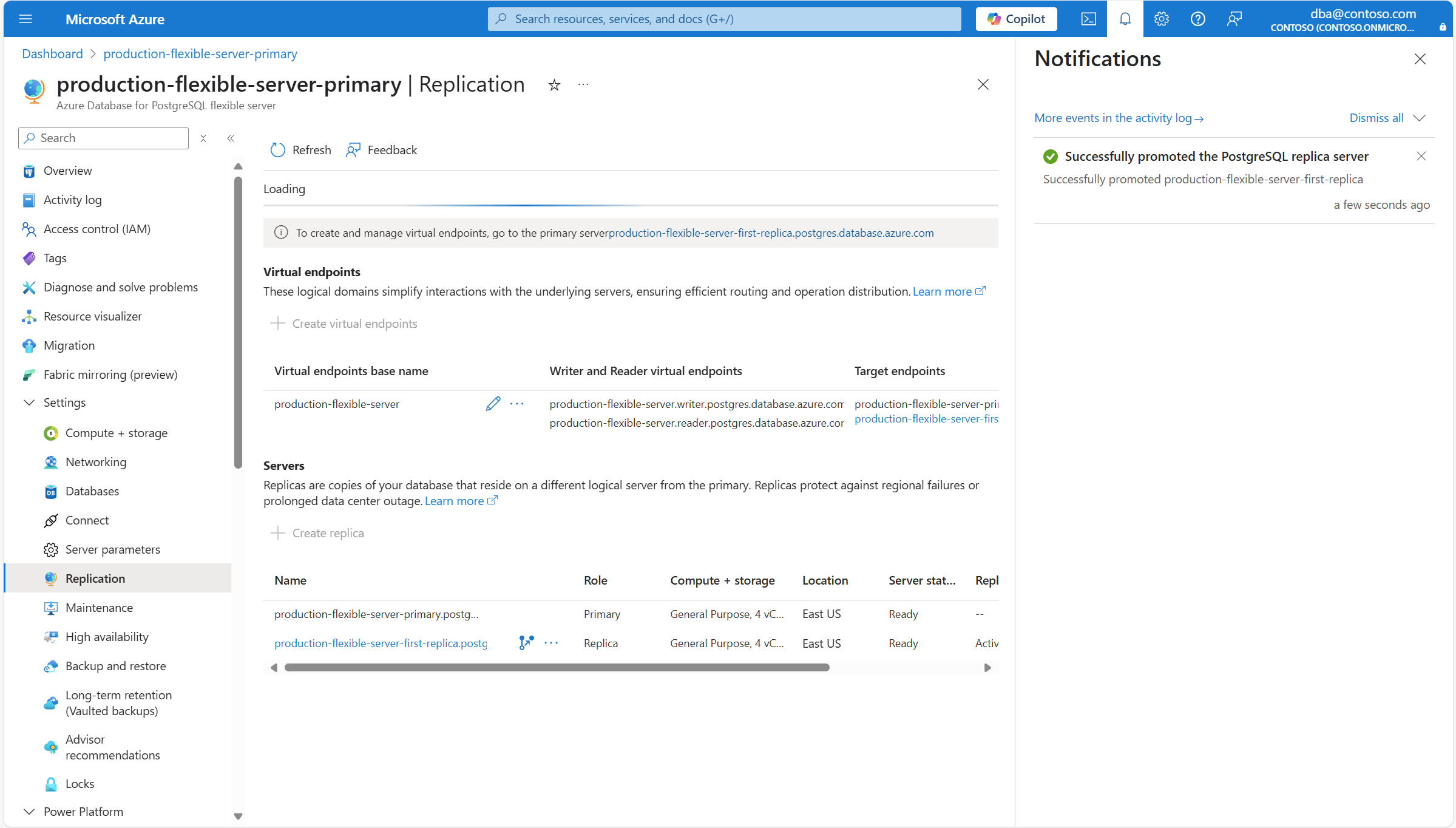 When the process completes, a notification informs you that the read replica successfully switched over to primary.