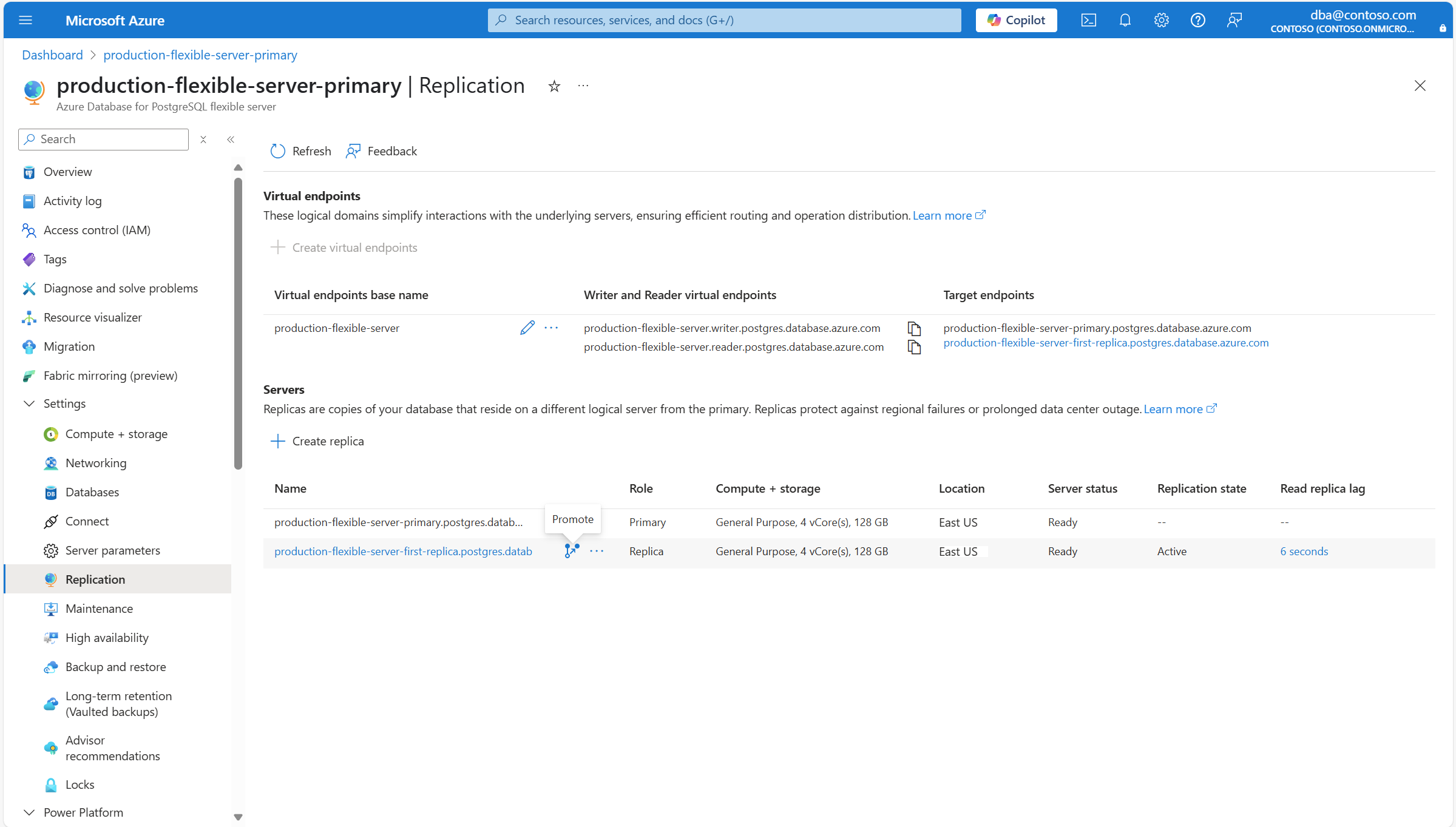 In Replica server to promote, select Promote to primary server for Action. And select Planned or Forced for Data sync, depending on what suits your needs best. if you decide to use the Forced option, you have to mark the I understand that any data changes that have not been replicated from the primary server will be lost. The read replica lag time is the approximate period of data loss. checkbox to acknowledge the potential data loss. Finally, select Promote.