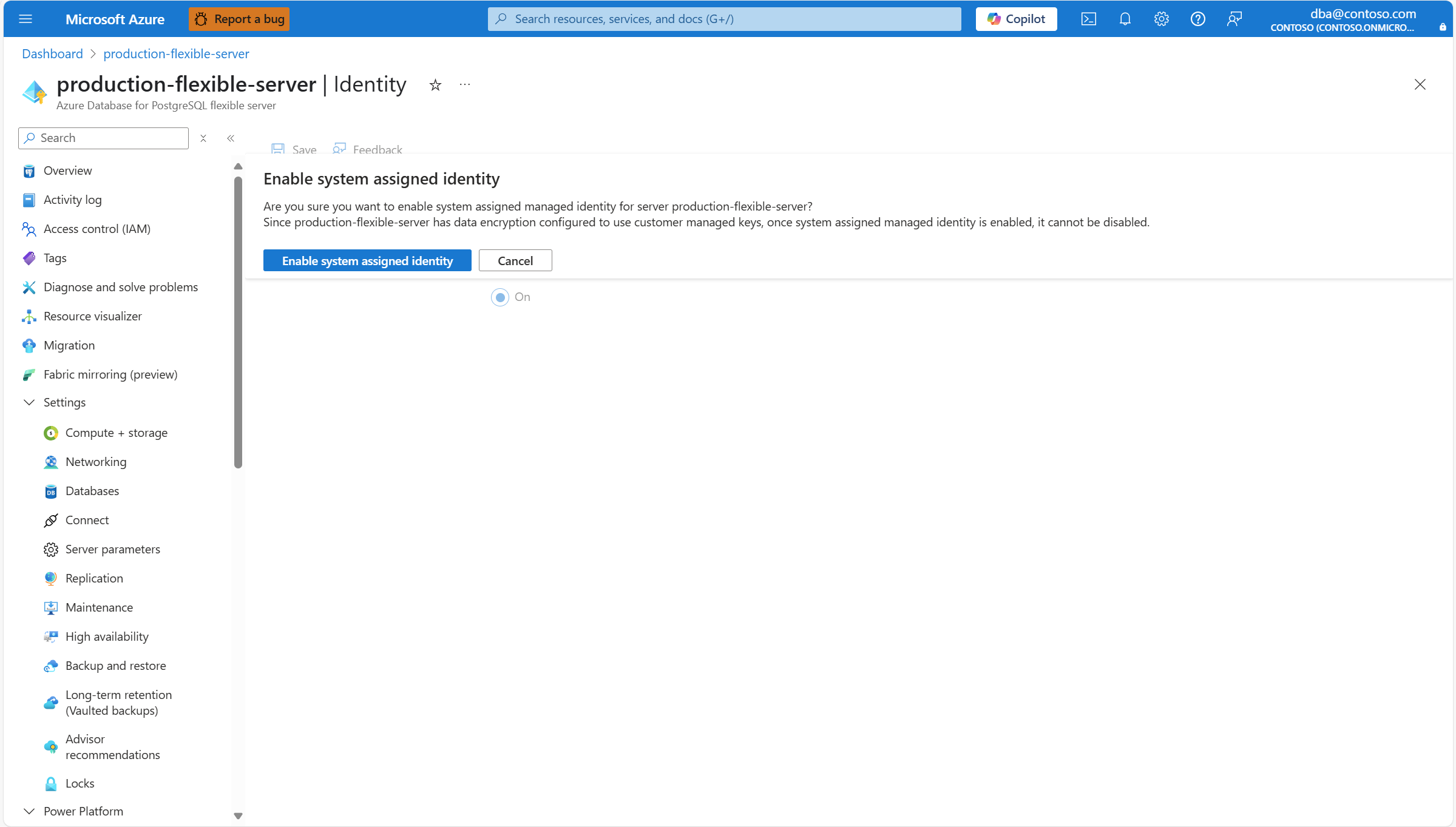 5. If the server has data encryption configured to use customer managed keys, it isn't supported to disable the system assigned managed identity of the server once you enable it. For that reason, if that condition is detected, you're requested to confirm that you want to enable the system assigned managed identity.