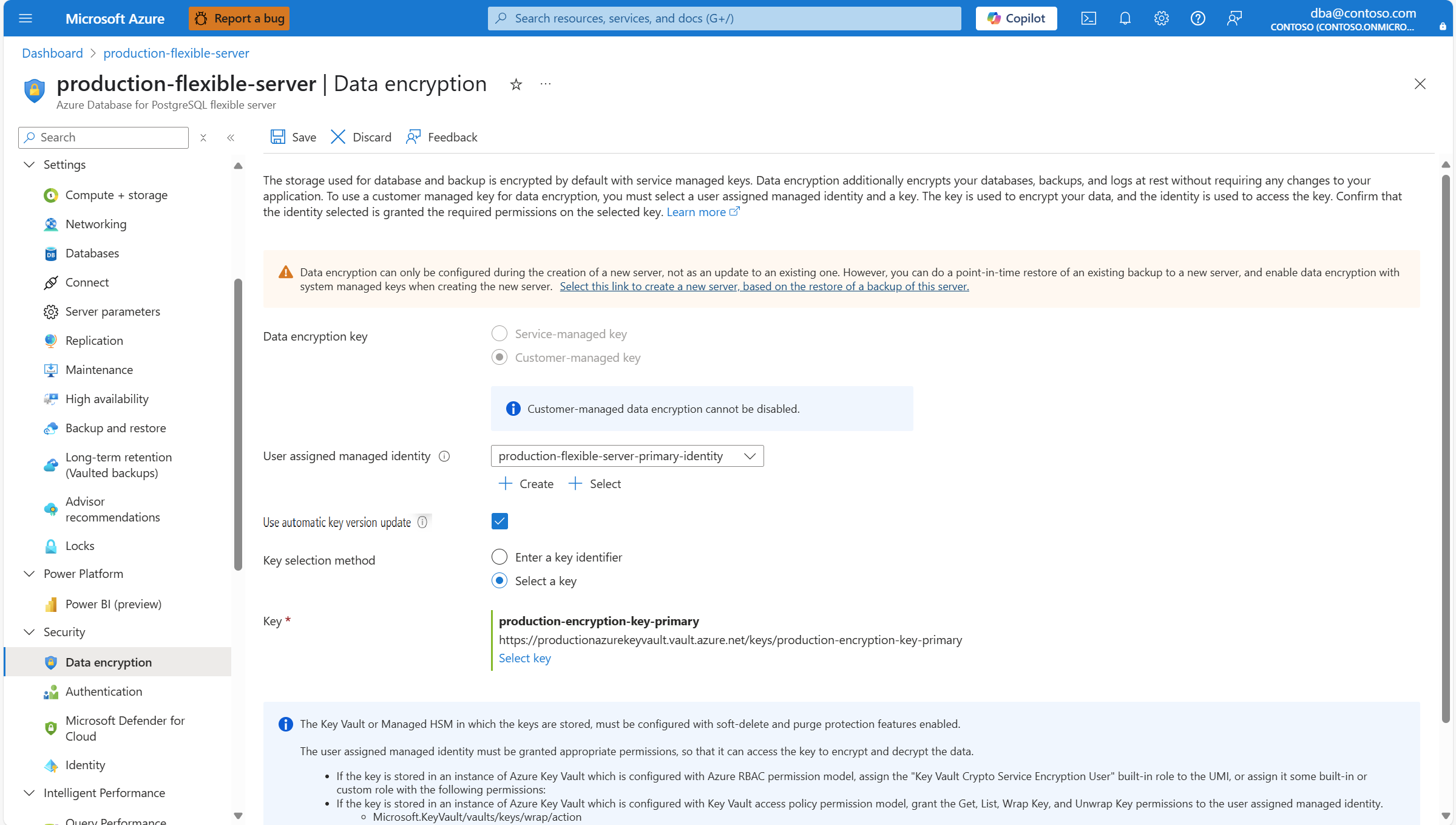 For existing servers that were deployed with data encryption using a customer managed key, you're allowed to do several configuration changes. Things that can be changed are the references to the keys used for encryption, and references to the user assigned managed identities used by the service to access the keys kept in the key stores.