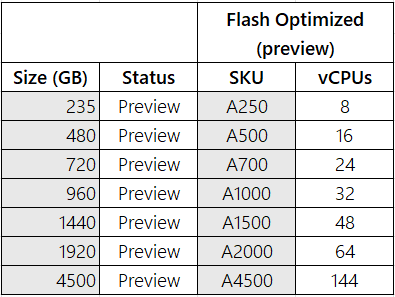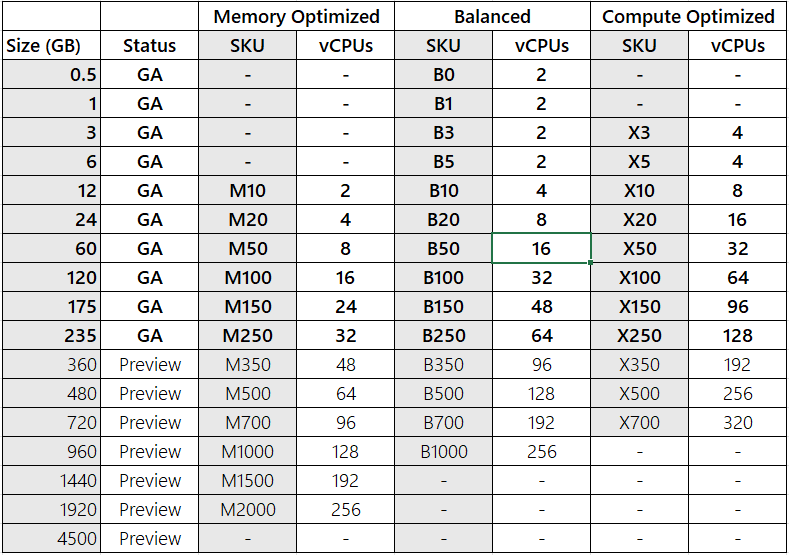 All in-memory tiers that use over 235 GB of storage are in Public Preview, including Memory Optimized M350 and higher; Balanced B350 and higher; and Compute Optimized X350 and higher. All these tiers and higher are in Public Preview.