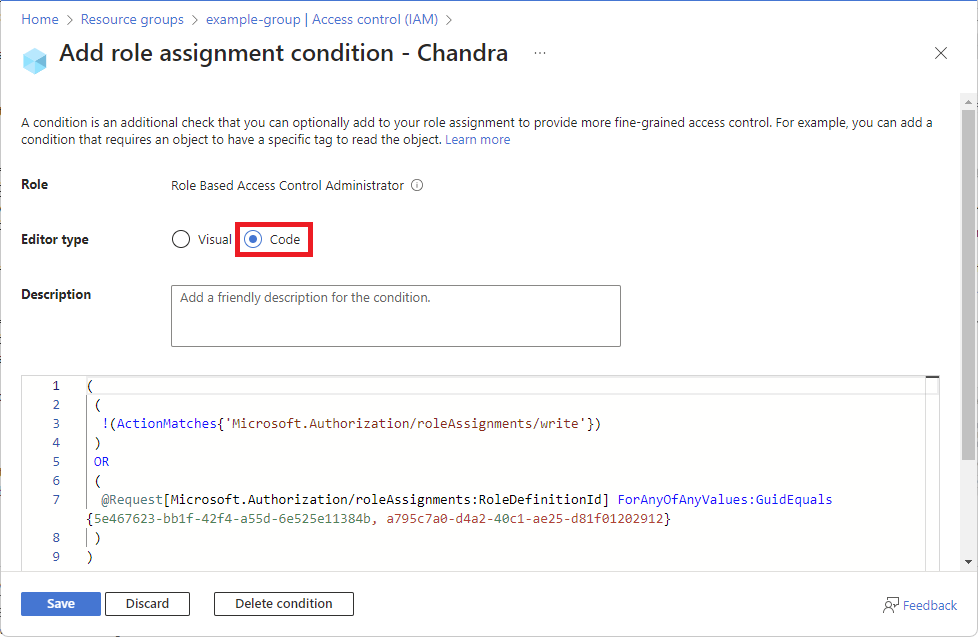 To edit the condition directly, select the Code editor type and then edit the code for the condition.