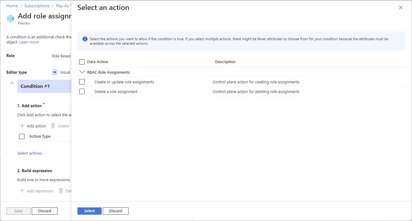 Condition template Select this template to Constrain roles Allow user to only assign roles you select Constrain roles and principal types Allow user to only assign roles you select