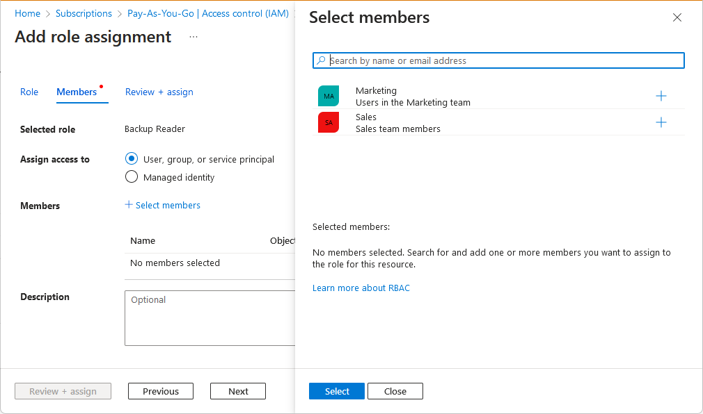 Microsoft.Authorization/roleAssignments/writeorMicrosoft.Authorization/roleAssignments/deleteactions, such as User Access Administrator, but Role Based Access Control Administrator has fewer permissions.On the Members tab, find and select the delegate.