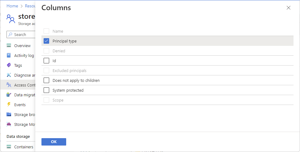 Column Description Name Name of the deny assignment. Principal type User, group, system-defined group, or service principal. Denied Name of the security principal that is included in the deny assignment. Id Unique identifier for the deny assignment. Excluded principals Whether there are security principals that are excluded from the deny assignment. Does not apply to children Whether the deny assignment is inherited to subscopes. System protected Whether the deny assignment is managed by Azure. Currently, always Yes. Scope Management group, subscription, resource group, or resource. Add a checkmark to any of the enabled items and then select OK to display the selected columns.