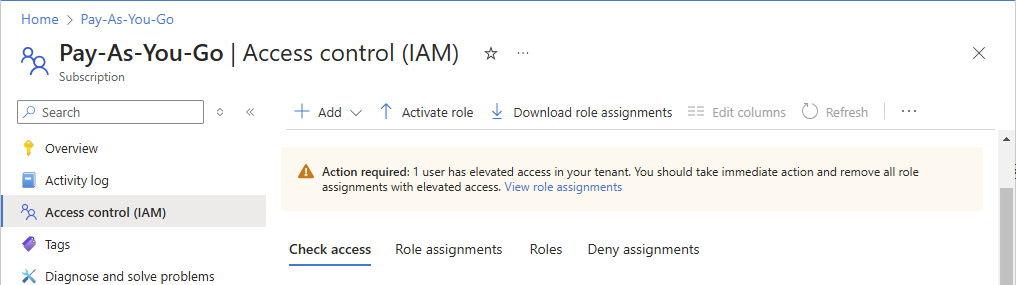 Action required: X users have elevated access in your tenant. You should take immediate action and remove all role assignments with elevated access. View role assignmentsSelect the View role assignments link to view a list of users with elevated access.